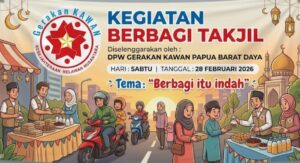Ketua DPW Gerakan Kawan Papua Barat Daya, Basiron, kepada media Honai Papua, Sabtu sore (28/2/2026), usai kegiatan pembagian takjil bersama jajaran pengurus Dewan Penasehat Hj. Haerudin, Wakil Sekretaris I Yohanis, Wakil Ketua Achmad, Hj. Samadi, serta Hj. Nurodin Safudin, menyampaikan bahwa kegiatan tersebut merupakan agenda sosial rutin selama Ramadan.